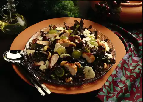 Remove from the pan and cut into slices. In the meantime, wash, halve and seed the grapes. Roast the cashew nuts in a pan. Cut cheese into pieces. Clean and wash the salad and pluck into bite-sized pieces.