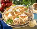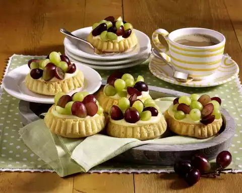 Separate eggs. Beat the egg whites and 2 tablespoons of cold water with the whisk of the hand mixer until stiff, adding sugar, vanillin sugar and salt. Stir in the egg yolks. Mix flour, starch and baking powder, sieve portions onto the egg mixture and fold in. Grease 10 coated tartlet cups (8/9 cm Ø) and sprinkle with flour. Pour in the sponge mixture evenly, smooth it down. Place on a grid. Bake in the preheated oven (electric cooker: 200 °C/ convection oven: 175 °C/ gas: level 3) for 13-18 minutes. Remove from the oven and let cool slightly on a grid. Carefully turn out of the moulds and let cool down. Wash the grapes, pluck them and let them drain on kitchen paper. Mix curd and wine, stir in sauce powder. Spread the cream on the tartlets and smooth it down. Halve about half of the grapes. Spread all the grapes on the cream and serve or chill