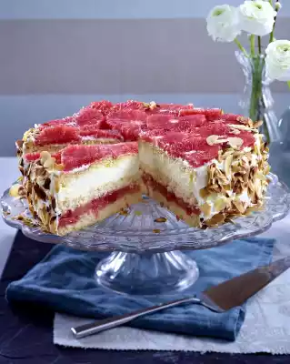 Remove the sponge cake base from the mould, cut through horizontally twice and place a cake ring around the lower base. Pour grapefruit juice with orange juice to 300 ml. Remove 2 tbsp. juice and mix with 25 g starch. Bring the rest of the juice and 1 tbsp. sugar to the boil and thicken with the starch. Remove from the heat and stir in grapefruit fillets. Spread the compote on the lower cake layer and place the 2nd layer on top. Chill the cake for about 15 minutes