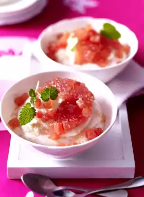 Peel 1 grapefruit so that the white skin is completely removed. Cut 1/2 grapefriut into thin slices, the other half finely diced. Decorate the cream with grapefruit and lemon balm before serving