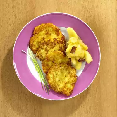Put lemon juice, about 250 ml water and sugar in a pot. Cut open the vanilla pod and scrape out the pulp. Add vanilla pulp and pod and cinnamon sticks. Peel apples, quarter them, remove seeds and cut them into slices and put them into the pot. Bring to the boil and steam in a closed pot for 12-15 minutes until the apple slices fall apart. In the meantime, peel and wash the potatoes and grate them finely. Peel onion and grate it to the potatoes.