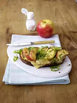 Grate cheese. Clean and wash spring onions and cut into thin rings. Mix cheese and 1/3 of the spring onions. Spread bread with mustard cream. Cut pork fillet into thin slices and cover bread with them. Spread apple slices on top and sprinkle with cheese mix