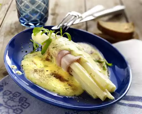 Lift the black salsifies out of the stock, allow to cool slightly. Cut the ham in half lengthwise. Wrap 2 slices of ham around 5-7 black salsifies and place on ovenproof plates. Pour the hollandaise sauce over them and grill under the hot grill of the oven for 2-4 minutes until golden brown.