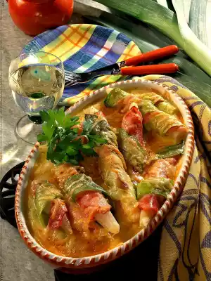 Drain black salsify, let it cool a little. Grease the baking dish. Wrap the black salsifies in ham and leek. Pour the sauce over it and sprinkle with the rest of the cheese.