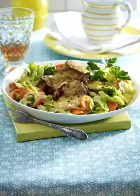 Add approx. 300 ml water, bring to the boil, cover and simmer for approx. 3 minutes. Add pointed cabbage, fold in, season with salt and pepper and bring to the boil again. Steam covered for 8-10 minutes. Cut pork fillets into small (40-50 g heavy) medallions. Heat 2 tablespoons of oil in a large frying pan and fry 8-10 medallions for about 4 minutes, turning them over. Season with salt and pepper and remove from the pan. Fry the remaining medallions in the same way. Add 20 g fat to the frying fat in the pan and fry the remaining onion cubes in it. Dust with flour and sauté briefly. Add stock and cream while stirring, bring to the boil and simmer for 4-5 minutes. Cut blue cheese into pieces and melt in the hot sauce while stirring.