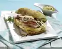 Wash fish, pat dry, season with salt and pepper and turn in 1 tablespoon of flour. Heat 1 tablespoon of fat and fry the fish for about 3 minutes on each side. Crumble crackers, mix with pine nuts and 1 tablespoon of melted fat. Place 2 white cabbage leaves on top of each other. Place the fish inside, spread with 1 tablespoon of sauce and form into packets. Spread the cracker mixture over the packets and bake in a preheated oven (electric cooker: 200 °C/ convection oven: 175 °C/ gas: level 3) for approx. 8 minutes. Clean and wash the peppers, dab dry and cut out 4 fish with a cookie cutter. Cut the remaining peppers into cubes. Heat 1 tablespoon of fat and fry the bell peppers for about 3 minutes. Cut open fish parcels if necessary and arrange on plates with sauce and diced peppers.