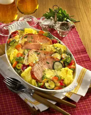 Fry the smoked pork on each side for about 3 minutes. Grease an ovenproof dish. Add the vegetables, purée and pork loin. Sprinkle cheese on top. Bake in a preheated oven (electric cooker: 200 °C/ circulating air: 175 °C/ gas: level 3) for approx. 5 minutes until the cheese has melted