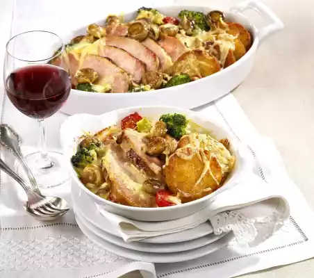 Take the meat out and cut into slices. Spread the meat with the rösti, broccoli and tomatoes in a greased flat casserole dish. Pour sauce over it. Sprinkle with the remaining cheese and bake in a preheated oven (electric cooker: 200 °C/ convection oven: 175 °C/gas: level 3) for approx. 25 minutes