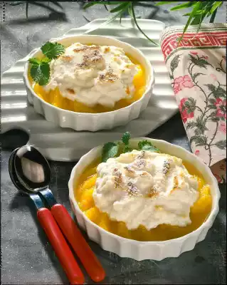 Fold the beaten egg whites into the quark mixture. Divide the orange filets into four small ovenproof casseroles. Spread the quark mixture evenly on top and bake in a preheated oven (electric range: 250°C/ gas: level 5) for 3-5 minutes until golden brown. Sprinkle with icing sugar and serve decorated with lemon balm leaves