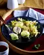 For the vinaigrette, whisk vinegar, salt, pepper, mustard and honey. Add oil drop by drop to the vinaigrette. Peel the shallot, cut into fine cubes and stir into the vinaigrette. Sort the salad, wash and shake dry.