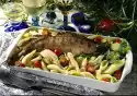 Spread the vegetable slices in the dish, salt the plaice fillets, fold half of them over and place them on the vegetables. Pour sauce over it. Bake in a preheated oven (electric: 200 °C/ gas: level 3) for 20-25 minutes. Garnish with dill and the remaining prawns