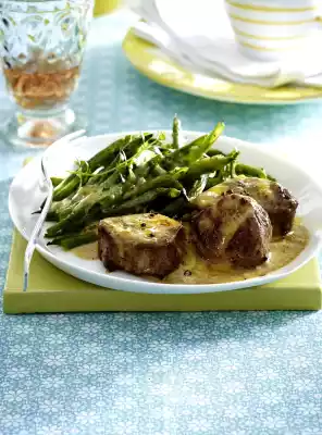 Season with pepper and possibly some salt. Chop the parsley. Drain the beans and remove the savory. Add the fat and parsley to the beans and toss in. Arrange the medallions and beans in ovenproof serving tins or a large mould.