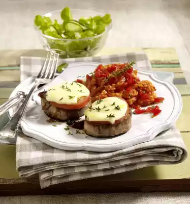 Heat 1 teaspoon of oil in a frying pan. Fry the medallions for about 3 minutes, turning them over. Cover with 1 slice of tomato and 1 slice of mozzarella. Sprinkle with thyme. Cover and fry on a low heat for another 3 minutes until the cheese has melted.