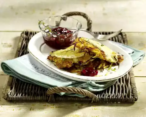 Cut the cheese into thin slices and spread them on the grated cake. Gratinate under the hot grill of the oven (or at highest heat in the oven) until golden brown. Serve with cranberries.