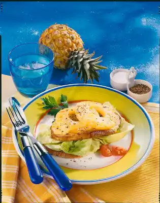 wash and dab dry. Heat oil in a pan and fry the meat in it over medium heat for 3-4 minutes on each side. Season with salt and pepper. Place on a baking tray lined with baking paper and cover with pineapple and cheese.