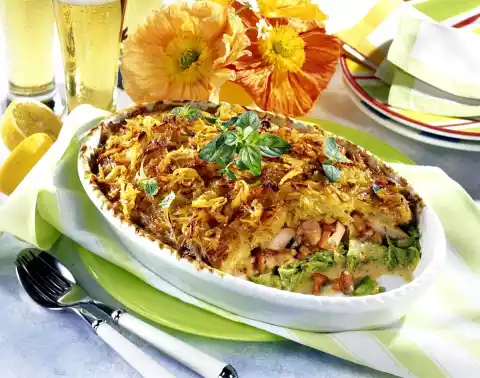 Pour the savoy cabbage onto the bottom of a greased casserole dish (approx. 30 cm long). First cut into strips and then the
