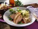 Briefly fry the cured pork loin in 1 tbsp. oil, remove. Heat 2 tbsp. oil in the frying fat. Sauté the rest of the onions in it. Add mushrooms, fry lightly and season with pepper. Sprinkle with flour and sauté briefly. Deglaze with 300 ml water and cream. Add herbs and 1 teaspoon broth, bring to the boil. Simmer for 3-4 minutes. Mix in smoked pork loin and braise for about 1 minute. Season to taste with salt and pepper