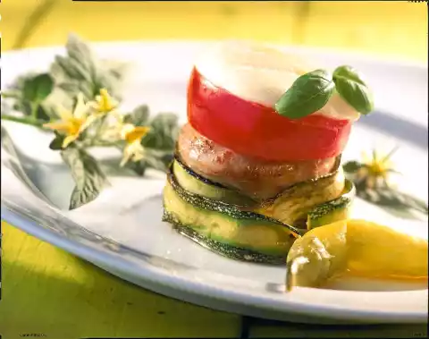 Wash medallions and pat dry. Clean and wash the zucchini and cut them into thin, wide strips with a peeler. Blanch briefly in boiling water and drain. Wrap 1-2 zucchini strips around each medallion and pin them with wooden skewers. Clean, wash and cut tomatoes into thick slices. Drain mozzarella and cut into 8 slices. Wash the basil.