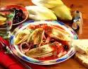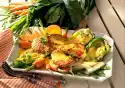 Sauté onion and flour in it. Add cream and vegetable stock while stirring constantly, bring to the boil. Melt half the cheese in it. Season to taste with salt, pepper, nutmeg and lemon juice. Cut ham into wide strips. Pour the prepared vegetables and ham into an ovenproof dish. Pour the sauce over them and bake in a preheated oven (electric cooker: 200 °C/ gas: level 3) for about 10 minutes. Serve sprinkled with chervil leaves as desired