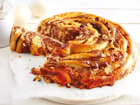 Preheat oven (electric cooker: 175 °C/circulating air: 150 °C/gas: see manufacturer). Coarsely chop the nuts. Whisk egg yolk and 2 tbsp. milk, brush the snail with it. Sprinkle with nuts. Bake in hot oven for 25-30 minutes.