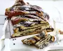 Grease the springform pan (26 cm Ø). Knead the dough again on a floured work surface and roll out to a rectangle (approx. 35 x 40 cm). Spread with nut mixture. Cut into 6 strips (each approx. 40 cm long).