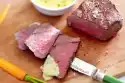 Heat butter in a frying pan. Sauté the Brussels sprouts for about 2 minutes while turning them over. Season with salt, pepper and 1 pinch of sugar. Cut the meat into slices. Serve with sprouts and chimichurris sauce.