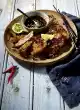 Wash the herbs, shake dry, pluck off the leaves and chop finely. Clean and wash the chillies and cut them into fine rings. (Careful! As the seeds are included, it gets hot.) Mix garlic, spring onions, lime juice and peel, herbs and chili in a bowl.