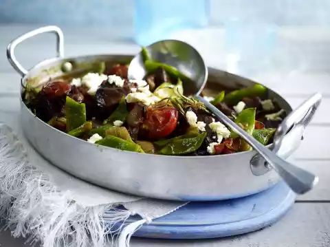 Peel and chop the onion. Wash the meat, dab dry and cut into cubes. Heat the oil in an ovenproof roasting pan. Fry the meat for about 8 minutes, turning it over. Season with salt and pepper.