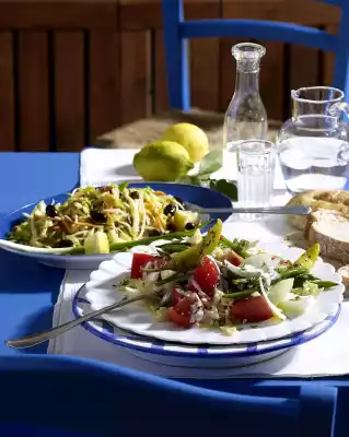 Season with salt, pepper and 1 pinch of sugar. Drain the noodles and beans, rinse with cold water and place in a bowl. Add onion and tomatoes and pour the yoghurt sauce over it. Mix well and season again.