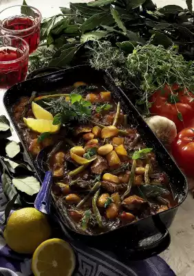 Gradually add the rest of the wine and 1/8 litre of water. Clean and wash the beans. Peel, wash and roughly dice the potatoes. Drain the white beans. Add everything after one hour. Wash tomatoes, cut into eighths and braise for the last 20 minutes.