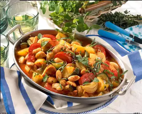 Add potatoes and tomatoes and fry for another 5 minutes. Deglaze with white wine, 1/8 l water and tomato juice. Cover and cook for about 20 minutes. Add zucchini, onions and bean seeds and braise for another 5 minutes.