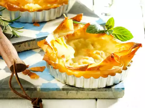 Dough sheets apart and cut into 3 strips. Spread each strip thinly with some butter. Place 2 strips overlapping in the moulds, pressing them to the edge. Spread the cheese mixture on top and place another 1 strip on top so that the cheese mixture is covered.