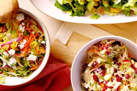 Peel and wash the carrots and cut them into fine sticks or grate them roughly. Drain the pepperoni and cut into rings. Peel onion and cut into fine strips. Crumble cheese. Mix everything with the cabbage, season again.