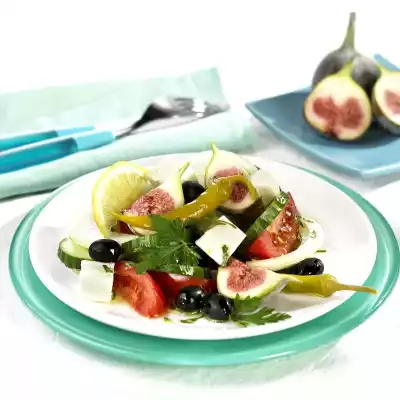 Wash the cucumber and cut into slices. Tomatoes wash, clean, cut into slices. Peel and halve the onion and slice finely. Quarter figs. Cut feta cheese into cubes. For the marinade, wash and chop parsley.