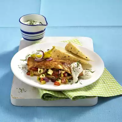 Fill the pockets with the feta-mix and bake in the preheated oven (electric cooker: 200 °C/ convection oven: 175 °C/ gas: level 3) for about 10 minutes. Wash 2 stems of parsley and cut into thin strips. Mix yoghurt and parsley and season to taste with salt and pepper. Cut 1 onion into thin strips. Garnish the cutlets with onion rings and the remaining pepperoni and serve with yoghurt sauce. Flatbread tastes good with it
