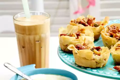 Stir everything with the whisks of the mixer for 8-10 minutes until frothy. Pour the crushed ice into twelve glasses. Pour coffee foam on top, fill up with cold milk or cold water. Serve immediately.