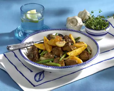 Season with thyme and lemon peel. Braise for another 30 minutes. Stir sour cream and flour until smooth, thicken sauce with it, bring to the boil. Warm up potatoes and beans. Season again with salt and pepper and serve in portions.