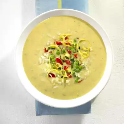Clean, wash and dice the zucchini. Defrost the peas a little. Add the vegetables to the soup 5 minutes before the end of the cooking time, bring to the boil and continue to simmer at medium heat. Stir in lemon juice. Season soup with salt and pepper, let it cool down. Stir the egg yolks into the soup and heat slowly over low heat (do not boil!) until the soup has a thick consistency. Garnish with lemon peel