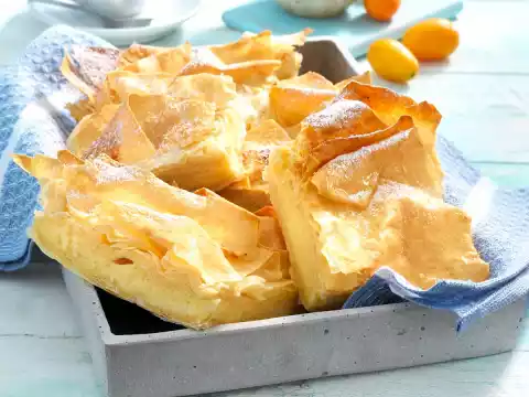 Melt the butter in a small pot. Grease a tart or springform pan (26 cm Ø). Spread out the dough sheets one by one, cut them into approx. 9 pieces each. Brush each sheet with the butter. Place half of the dough pieces in the mould, slightly overlapping, so that several layers (approx. 5, each layer consisting of several sheets) are created. Add semolina mixture and smooth it down. Lay the rest of the dough back on top, overlapping again.
