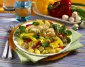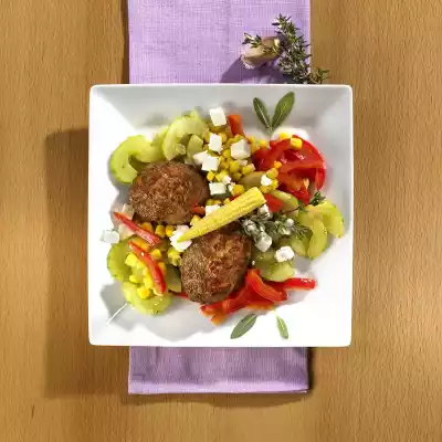 Halve the pepper, remove the seeds, wash and dice the fruit. Fry the onion in the oil until transparent. Add cucumber pieces and strips of paprika and braise for a short time while stirring. Deglaze with broth and simmer in the closed pan for 8-10 minutes. Season with thyme and stir in corn grains. Crumble cheese over it and garnish with sage leaves. Serve the mince with the vegetables