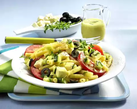 In the meantime, wash the cucumber, quarter it, remove the seeds and cut into cubes. Tomatoes wash, dry grate, halve and cut into slices. Cut cheese into cubes. Drain olives, drain and cut into rings.