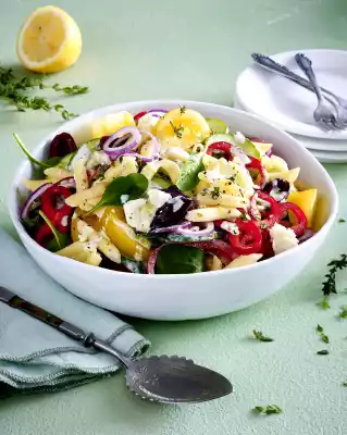 Drain the pasta, rinse with cold water and mix with cheese, cucumber, paprika, onions, tomatoes and dressing. Fold in spinach and olives. Season to taste with salt and pepper.
