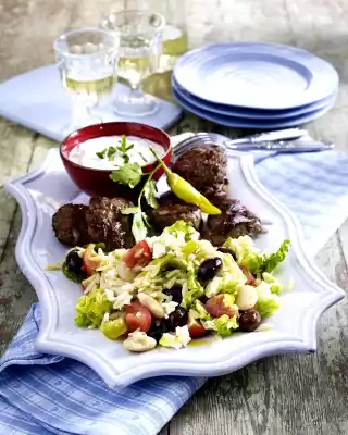 Defrost lamb medallions in the refrigerator overnight according to package instructions. Prepare pasta in boiling salted water according to package instructions. Wash, clean and roughly dice the tomatoes. Cut pepperoni into rings, except for something to garnish. Pour beans into a sieve and rinse. For the salad dressing, whisk vinegar, salt, pepper, 1 tablespoon of mustard and honey. Add 4 tablespoons of oil drop by drop. Peel the shallot, cut into fine cubes and stir into the vinaigrette. Drain the pasta and rinse with cold water. Mix the pasta, tomatoes, olives, pepperoni, beans and salad dressing and leave to stand. Peel 1 onion. Wash and clean the cucumber. Grate cucumber and onion roughly. Wash parsley, shake dry, pluck the leaves from the stalks and chop them, except for something to garnish. Peel garlic and press it through a garlic press. Mix cucumber, onion, garlic, parsley, except for a little bit for garnishing, and yoghurt. Season to taste with salt and pepper. For the meatballs peel the remaining onion and cut it into fine cubes. Knead minced meat, diced onion, egg, breadcrumbs, milk and 1-2 tsp. mustard. Season with salt and pepper. Form minced meat into 8 meatballs. Heat 1 tablespoon of oil in a frying pan. Fry the meatballs in portions for about 8 minutes while turning. Heat 1 tablespoon of oil in a second pan and fry the defrosted lamb steaks for approx. 6 minutes, turning them over. In the meantime, clean and wash the romaine lettuce, shake dry and cut the leaves into strips. Crumble feta cheese. Season pasta salad with salt and pepper, mix in romaine lettuce and feta cheese. Arrange tzatziki, meatballs, steaks and salad. Sprinkle with parsley and garnish with parsley and pepperoni