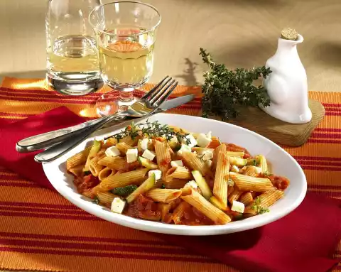 Add the zucchini and fry for about 5 minutes. Deglaze with tomatoes and cream. Chop the tomatoes a little bit. Season sauce with vegetable stock, bring to the boil and cook for about 5 minutes. Cut feta into cubes. Add thyme to the sauce.