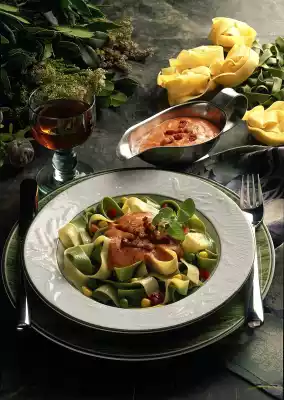 Add tomato puree and herbs. Stir in crème fraîche and season to taste with salt, pepper and Tabasco. Drain the pasta and arrange on 4 plates. Sprinkle bacon on top and garnish with herbs.
