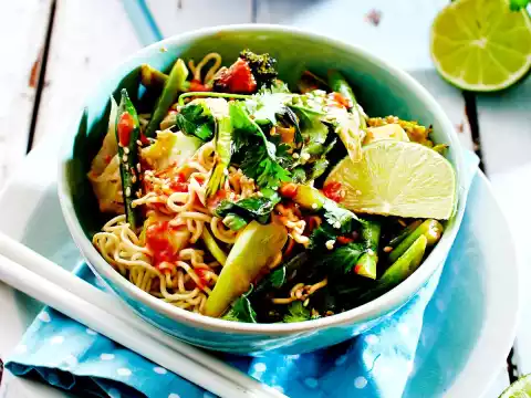 Roast the sesame seeds, take them out of the pan. Heat the oil in it. Fry the beans, broccoli, pak choi and garlic. Add coconut milk, lime juice, soy sauce and sambal oelek, bring to the boil. Wash the coriander and remove the leaves.