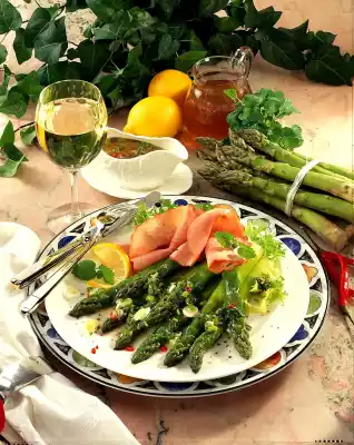 Mix in spring onions and chili. Clean, wash and drain the salad. Arrange lettuce, asparagus and ham on plates, spread some vinaigrette over it, add the rest of the vinaigrette extra. Garnish with lemon wheels and lemon balm and serve sprinkled with coloured pepper