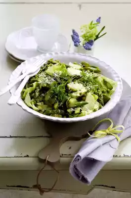 Season to taste. Clean, wash and tear salad into pieces. Grate cheese. Before serving mix in parmesan and salad leaves.