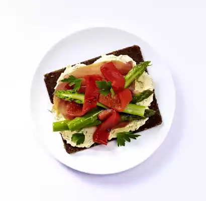 Mix cream cheese with paprika powder and chopped parsley. Season to taste with salt and pepper. Spread pumpernickel with cream cheese and cover with ham, asparagus and strips of paprika. Garnish with parsley leaves