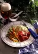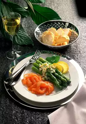 Whip the oil into it and add the egg cubes and spring onion rings. Arrange asparagus and salmon on a plate. Pour vinaigrette over the asparagus. Sprinkle salmon with some freshly ground pepper. Garnish with thinly sliced lemon slices and lemon balm. Serve with baguette